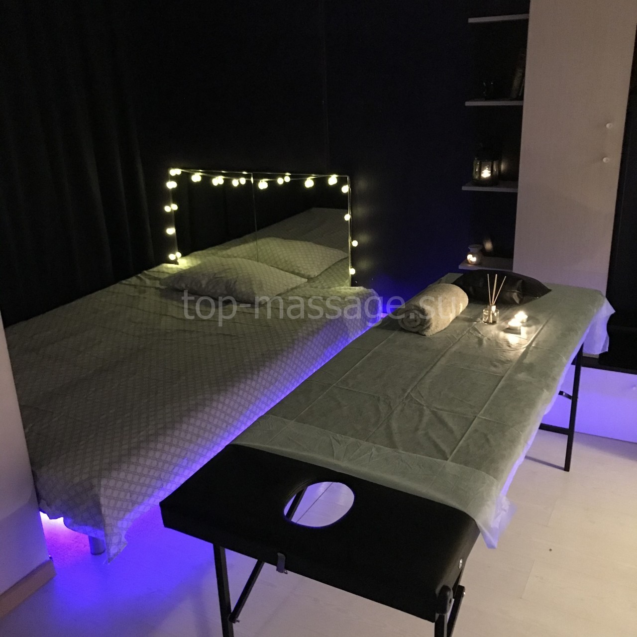 Атмосферная подсветка,ароматические свечи,приятная музыка,удобный массажный стол с силиконовой подушкой от следов и отеков на лице!